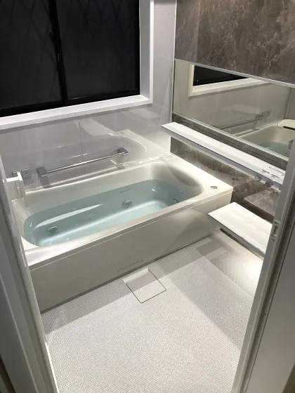 寒い日も一気に浴室を温めてくれる標準搭載の『暖房換気扇』や、きれい除菌水で床まわりのきれいがつづく『床ワイパー』もオプションで付けました。バスタイムがとても快適になり、お客様にも大変ご満足いただけました!